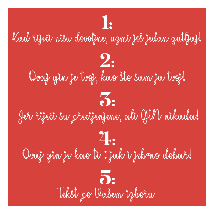 Ono što čini naš gin posebnim jest mogućnost potpune personalizacije. Svaka boca dolazi s personaliziranom etiketom koju možete prilagoditi prema Vašim željama. Dodajte ime i odaberite tekst ili dodajte vlastiti kako biste stvorili jedinstven poklon koji će oduševiti Vašu voljenu osobu.