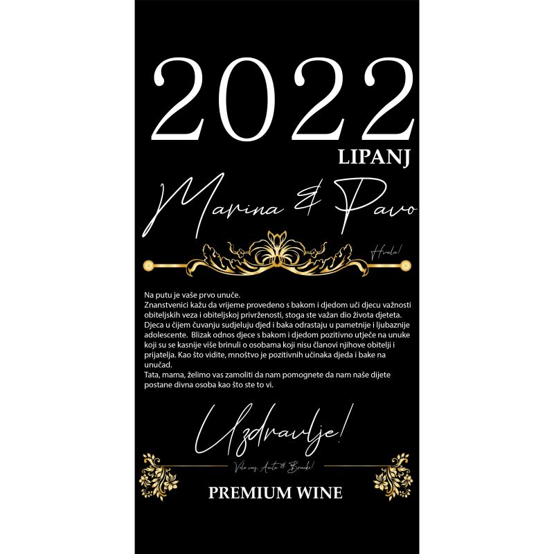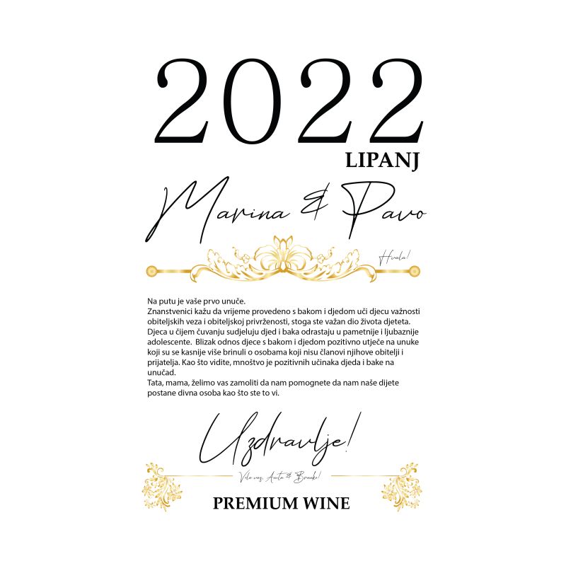 Želiš roditeljima reći da će postati djed i baka, i zajedno s njima, nazdraviti ovom važnom događaju. Imamo rješenje za tebe. Pokloni budućoj baki i djedu ovo vrhunsko bijelo ili crno vino. Unaprijed zahvali budućem djedu i baki na ovoj važnoj ulozi koja ih čeka ukoliko pristaju na navedeno. Zamoli ih da ti pomognu u odgoju djece i navedi im dobrobiti njihove uključenosti u odgoj unuka/unuke. Uzdravlje!